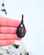 Silver Obsidian wrapped in black featuring a natural fire opal gemstone.